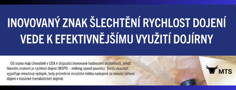 Od srpna mají chovatelé v USA k dispozici inovované hodnocení dojitelnosti, jehož hlavním znakem je rychlost dojení (MSPD - milking speed pounds). Tento ukazatel vyjadřuje minutový výdojek, tedy průměrné množství mléka nadojené za minutu během dojená v klasické (nerobotické) dojírně. Pro zobrazení klikněte níže na odkaz,...
